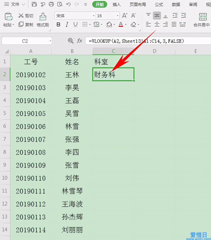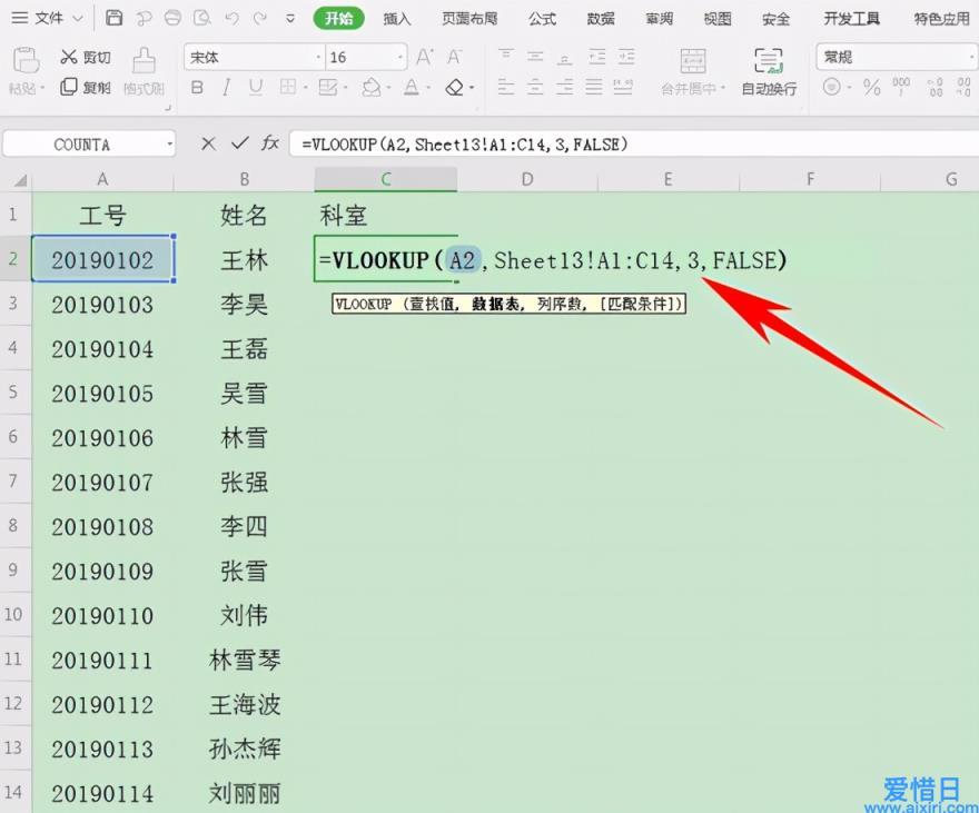 然后在单元格当中输入VLOOKUP函数公式,如下图所示,3代表科室存在于表2的第三列,FALSE代表精确匹配: