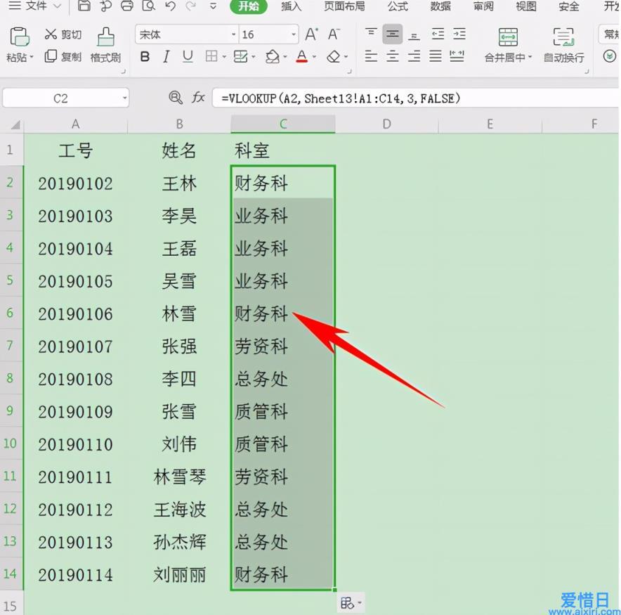单击回车,我们看到科室就显示为财务科了,如下图所示: