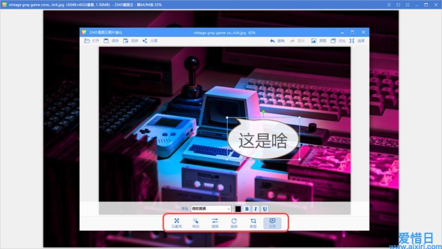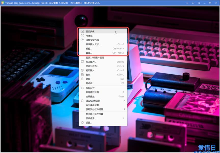 看图王的右键菜单提供了基础的图片编辑功能,譬如为图片添加滤镜、马赛克、添加文字气泡以及改变图片尺寸。