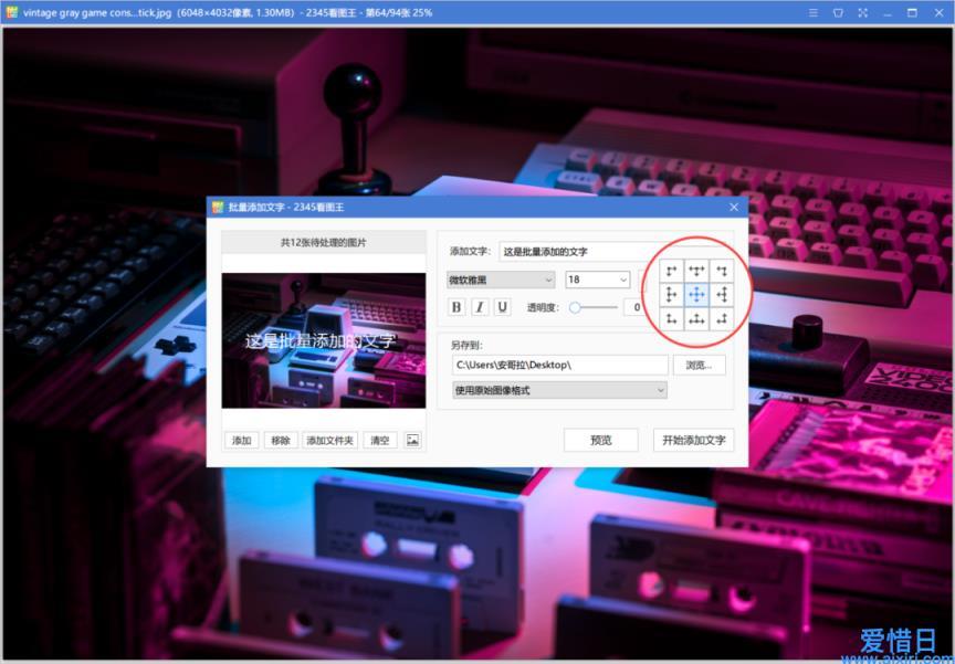 以批量添加文字为例,右侧的面板可以设置文字的字体、字号大小等样式,但不能自由移动文字的位置,只能从最右侧的预设选择文字的位置。