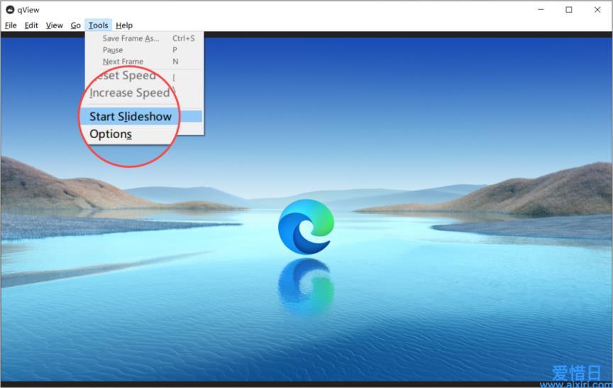 qView 保留了以前 Win7 自带的「照片查看器」的「幻灯片放映」功能,点击顶部菜单栏的「Tools」选项卡,选择「Start Slideshow」,就会按相同的时间间隔自动切换图片进行放映。