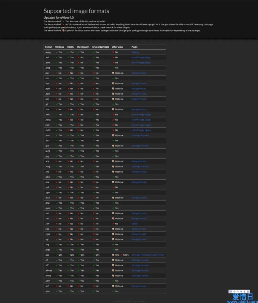 qView 的官网列出了原生支持查看的图片格式,包含我们平时常用的图片格式,例如 jpeg、png、gif 和 tiff 等。
