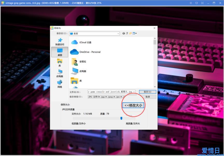 从看图王中导出图片时,当你选择的文件类型为 JPG,点击下方的「修改大小」,可以直接调节导出的图片质量,且会计算相应的文件大小。