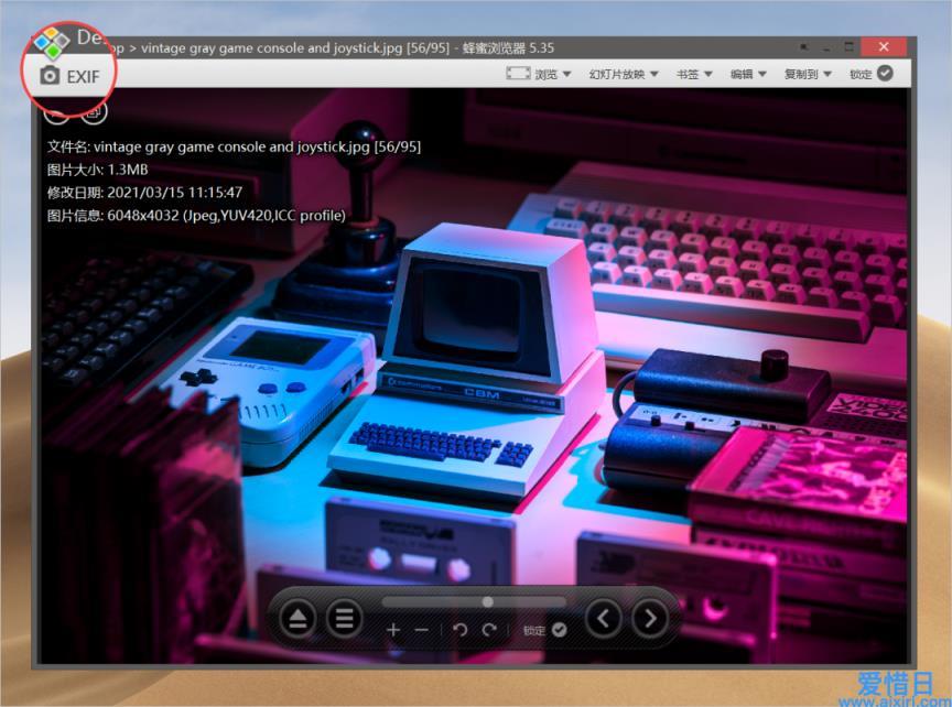 点击 HoneyView 左上角的「EXIF」选项,下方会显示图片的相关信息,例如文件名、图片大小、修改日期和图片信息。