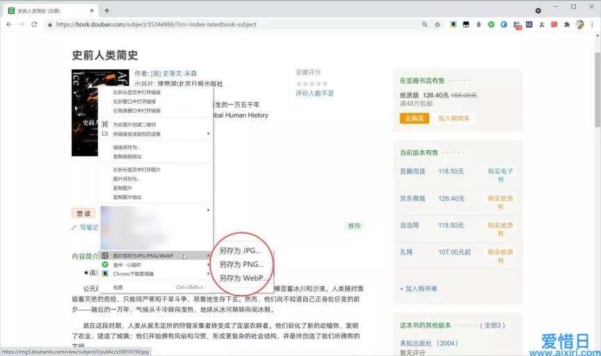 第二个方法是在 Chrome 中安装一个浏览器插件「图片另存为JPG/PNG/WebP」,右键菜单可以选择保存的图片格式,一步到位,省去了中间转换图片格式的操作。