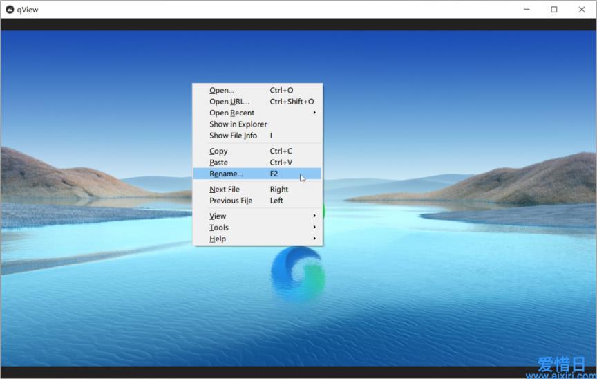 除了切换和旋转图片,qView 的其他操作都放在了右键菜单中:打开网页图片、打开图片所在位置、显示图片信息和重命名图片。
