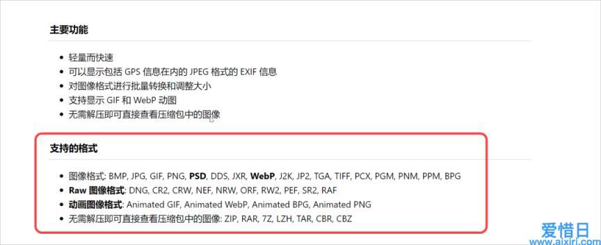 HoneyView 支持打开的文件格式如下,有常见的图片格式,也有比较少用、暂未普及开来的图片格式 WebP。