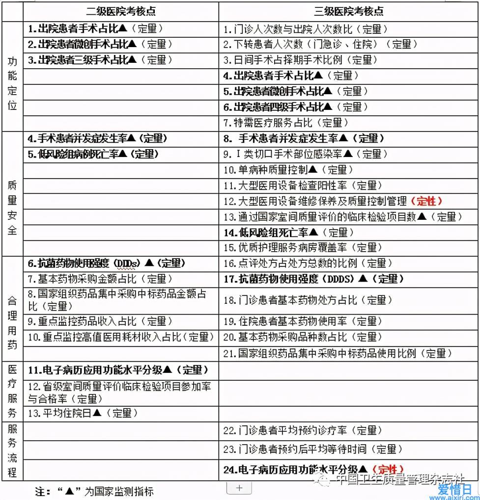 三级医院涵盖二级医院所有考核点,差别体现在医院的功能定位上。例如,三级医院要体现医改分级诊疗的导向作用,收治疑难复杂和危急重症患者,逐步下转常见病、多发病和疾病稳定期、恢复期患者(考核点2);要开展日间手术,提高医疗服务效率,缓解“住院难”“手术难”问题(考核点3);还要体现公益性,特需服务比不超过全国医疗服务的10%,但也鼓励在市场竞争中实现市场调价作用,引导资源有效配置(考核点7)。