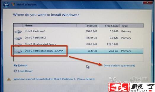 选择之前我们用BOOTCAMP 分的32 G的分区,然后点击 Drive options (advanced) 这个连接。