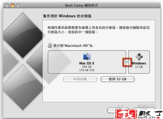 你可以在这里建立一个Windows分区,拖拽中间的竖条来给Mac系统和Windows分配空间。Windows 7大概最少需要10 GB的空间,如果你还要安装其他程序则需要更大,确定开始分区。