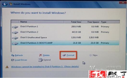 这时下面出现多个选项,先选中之前我们要安装的那个32 G的BOOTCAMP分区,然后点击Format格式化选项开始格式化分区,这里不能选错分区。