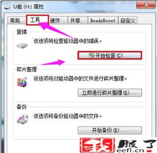 2、在属性窗口中选择“工具”栏目,并点击“开始检查”按钮: