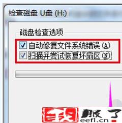 3、此时会弹出一个磁盘检查选项窗口,先将两个选项都勾选上,再点击“开始”按钮,u盘中的文件越多,检查修复时间越久,耐心等待即可: