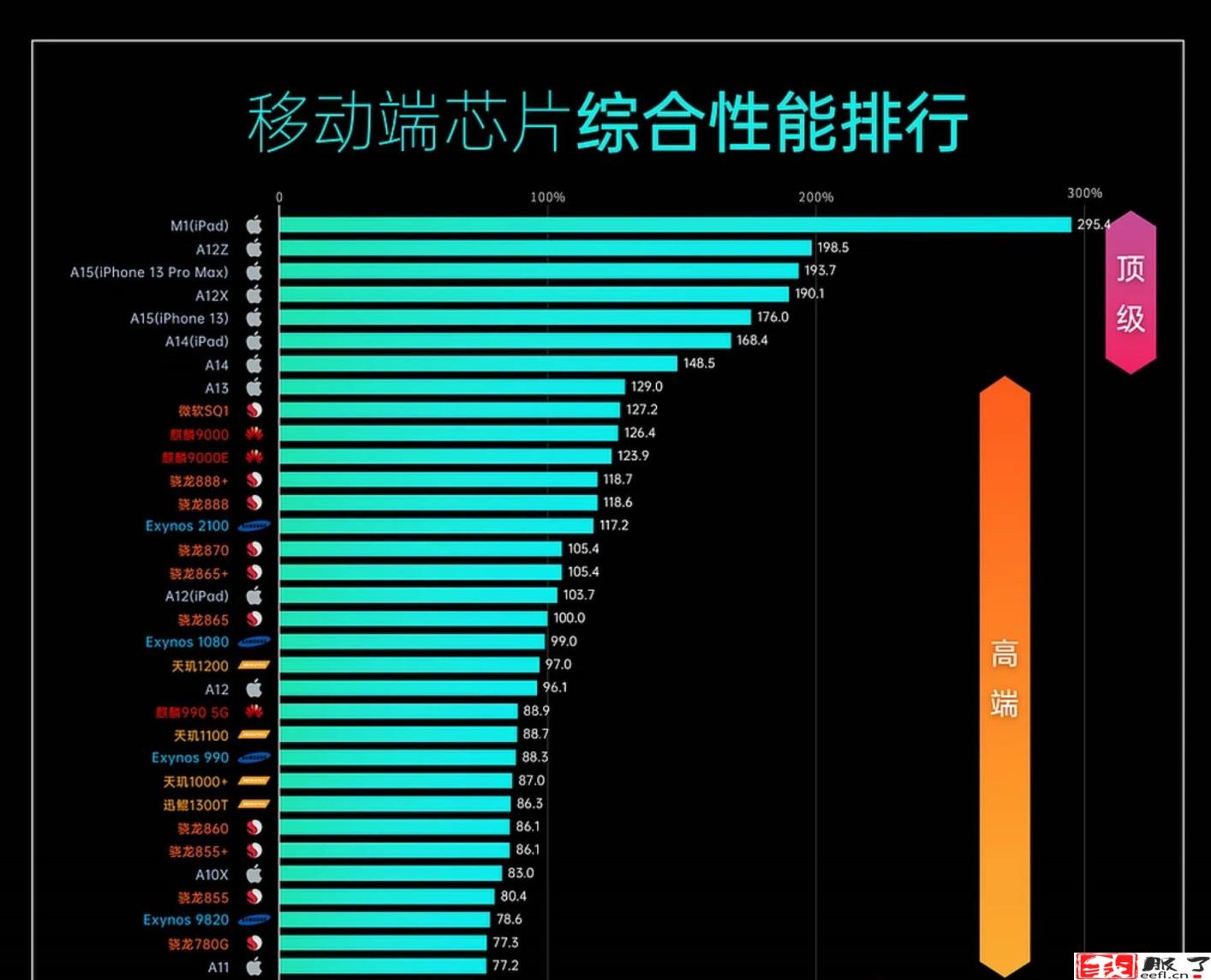 数码评测组织极客湾以骁龙865为基准(也就是该芯片评分为100),评测制作一张最新SoC性能天梯图。评测标准为CPU权重占比50%、GPU权重50%,不包括功耗、AI、ISP、基带性能。