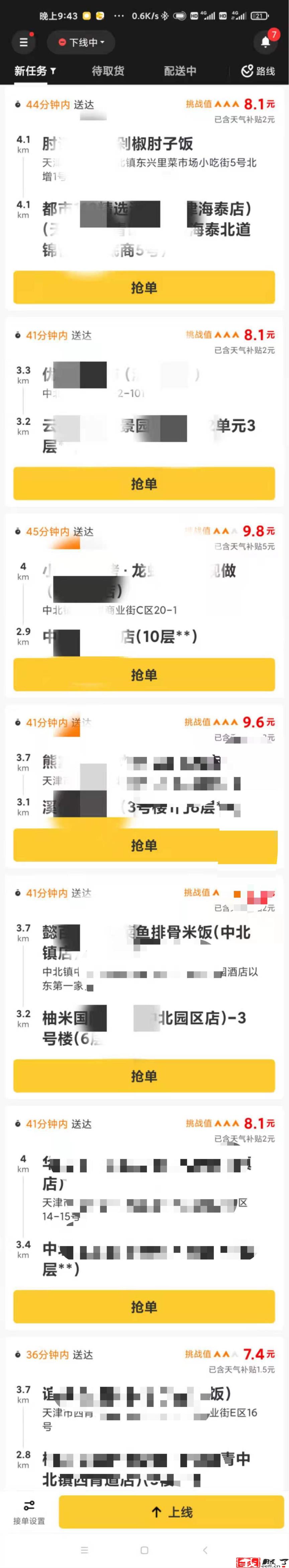所以说你要选择一个单量足够多的地方,哪里的单多?越繁华的地方单量越多,首推一线城市,京沪广深。我在天津送外卖,虽然比一线城市差一下,但是单量也是相当不错了,如果你在小县城送单,就是你一天24小时不休息,没有这么多订单也是白费力气。所以说位置最重要,还有大城市的单价也要比小县城的单价高很多,我这里的单价虽然比前几年降了很多但是还能平均到6.5一单。小县城没有这单价吧。