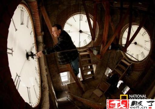 2014年3月8日,堪萨斯州克莱县法院(Clay County Courthous)的楼顶,一名男子正在检查钟面。摄影:CHARLIE RIEDEL,美联社