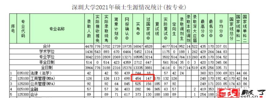 深圳大学2021年MBA实考454人,过国家线人数仅为147人,过线率仅为32.4%。