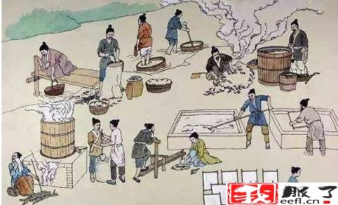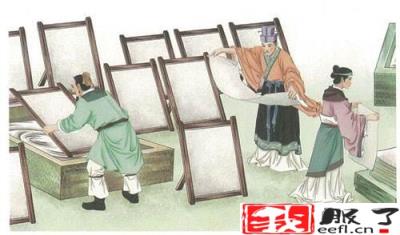 蔡伦先是将破布、苎麻等原材料放在水池中浸泡,时间久了,植物纤维自然就分离了出来。随后再将纤维打碎、捣烂成纸浆,再用竹片把纸浆捞起来晾晒。干了以后就成为了纸张。