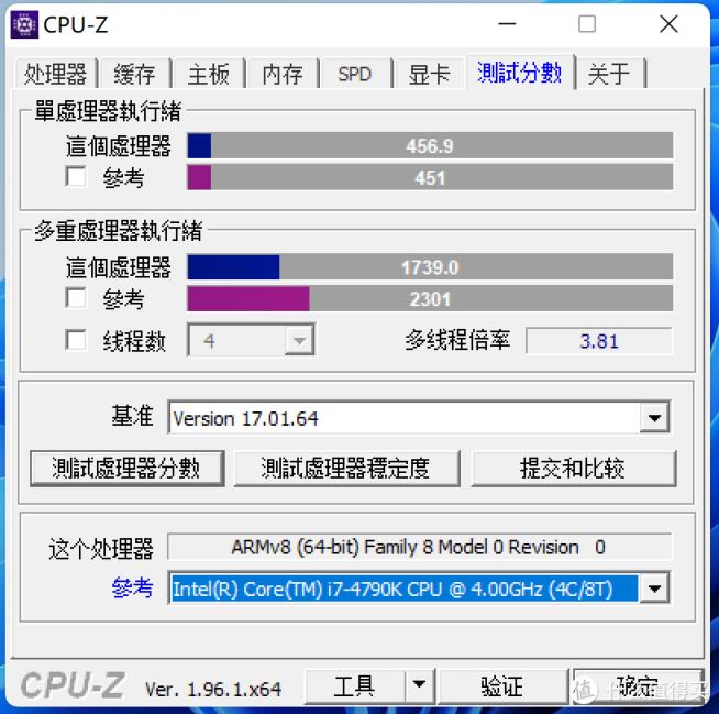 用64位的CPU-Z测一下,测得性能和老i7-4790K有一拼。原生的ARM架构测试这里就不必做了吧,ARM架构里M1芯片有多么强悍