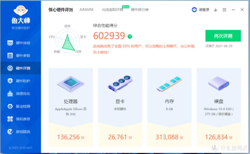 在虚拟机Windows 11下运行了一下鲁大师跑分,M1居然可以跑到60万分,有点夸张啊,毕竟这还是ARM精简指令集转译后的跑分!