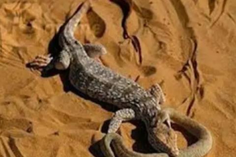 眼斑巨蜥是一种主要生活在澳大利亚沙漠中的大型动物,也是该地区的顶级猎食者,身长最长可达2.5米,体型虽然短,但奔跑速度很快,平时主要以一些蛇类和其他蜥蜴为食。