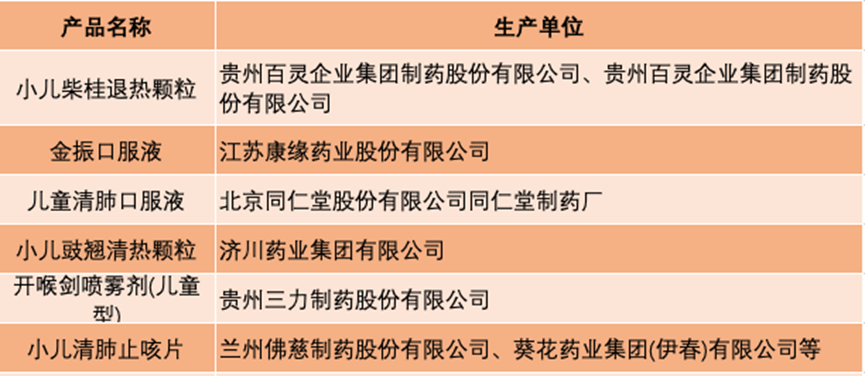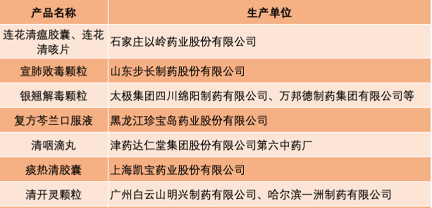 如连花清瘟胶囊(颗粒)、金花清感颗粒、化湿败毒颗粒、宣肺败毒颗粒、热炎宁合剂、银黄清肺胶囊、连花清咳片、六神丸(胶囊)、银翘解毒颗粒、金叶败毒颗粒、蓝芩口服液、复方芩兰口服液、清咽滴丸、喉咽清颗粒、桑菊感冒片、夏桑菊颗粒、痰热清胶囊、双黄连口服液、柴芩清宁胶囊、抗病毒口服液、感冒退热颗粒、消炎退热颗粒、清开灵颗粒、小柴胡颗粒等。
