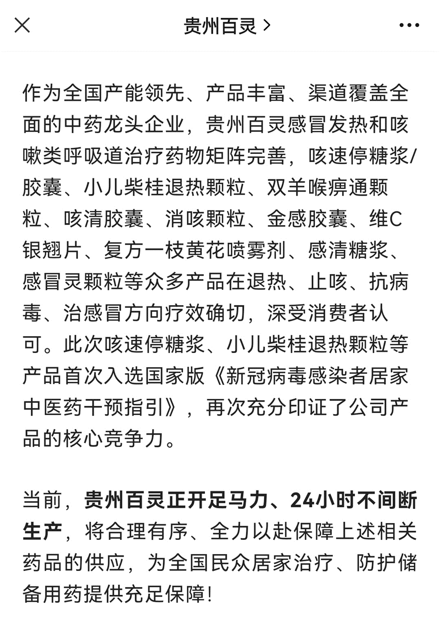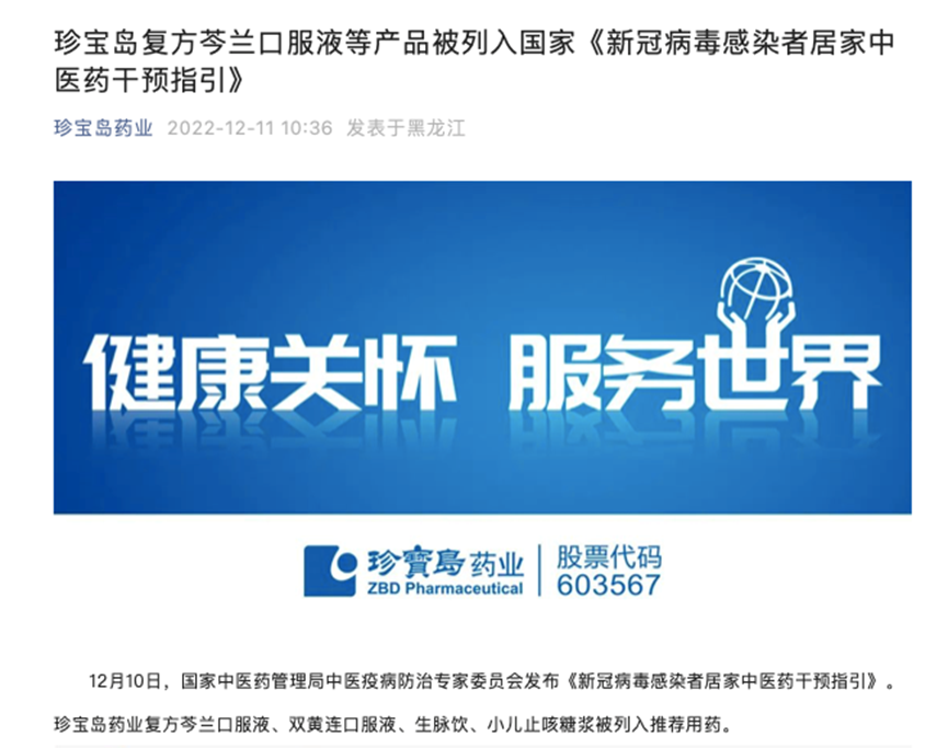 珍宝岛药业通过微信公众号表示,公司此次有复方芩兰口服液、双黄连口服液、生脉饮、小儿止咳糖浆被列入指引推荐用药。