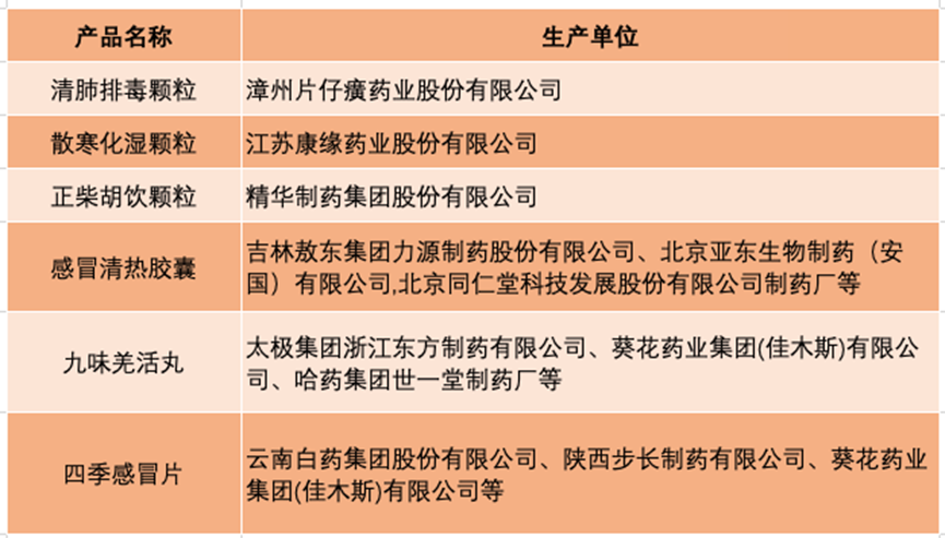 国家药品监督管理局网站信息显示,清肺排毒颗粒、散寒化湿颗粒、正柴胡饮颗粒均只有一家生产单位,分别为A股公司片仔癀、康缘药业、精华制药。