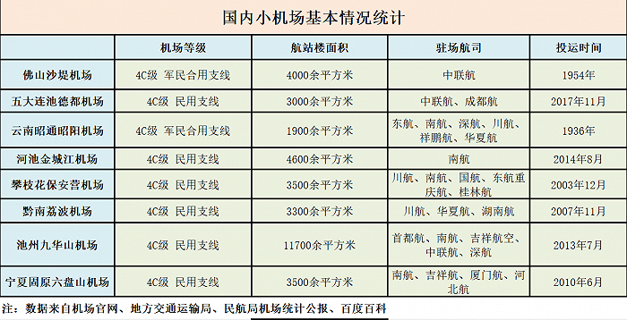 从所处地理位置来看,这些机场多数坐落在四线乃至五线城市,例如五大连池德都机场、黔南荔波机场位于四线城市,攀枝花保安营机场、河池金城江机场、固原机场等均在五线城市。不过,也不乏佛山沙堤这样处于新一线城市的机场,公开资料显示,佛山是广东省辖地级市、特大城市,2021年GDP达到1.2万亿元,稳居广东第三位。