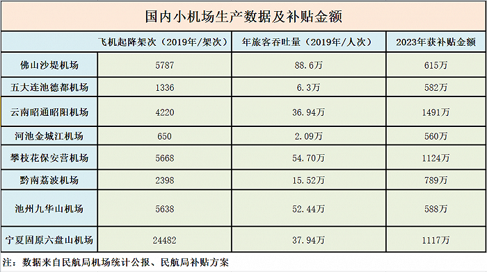 例如,在前述十余家小机场中,2023年云南昭通昭阳机场获补贴为1491万元;攀枝花保安营机场次之,为1124万;河池金城江机场、五大连池德都机场、池州九华山机场获补贴金额相对较少,均在500万-600万元之间。