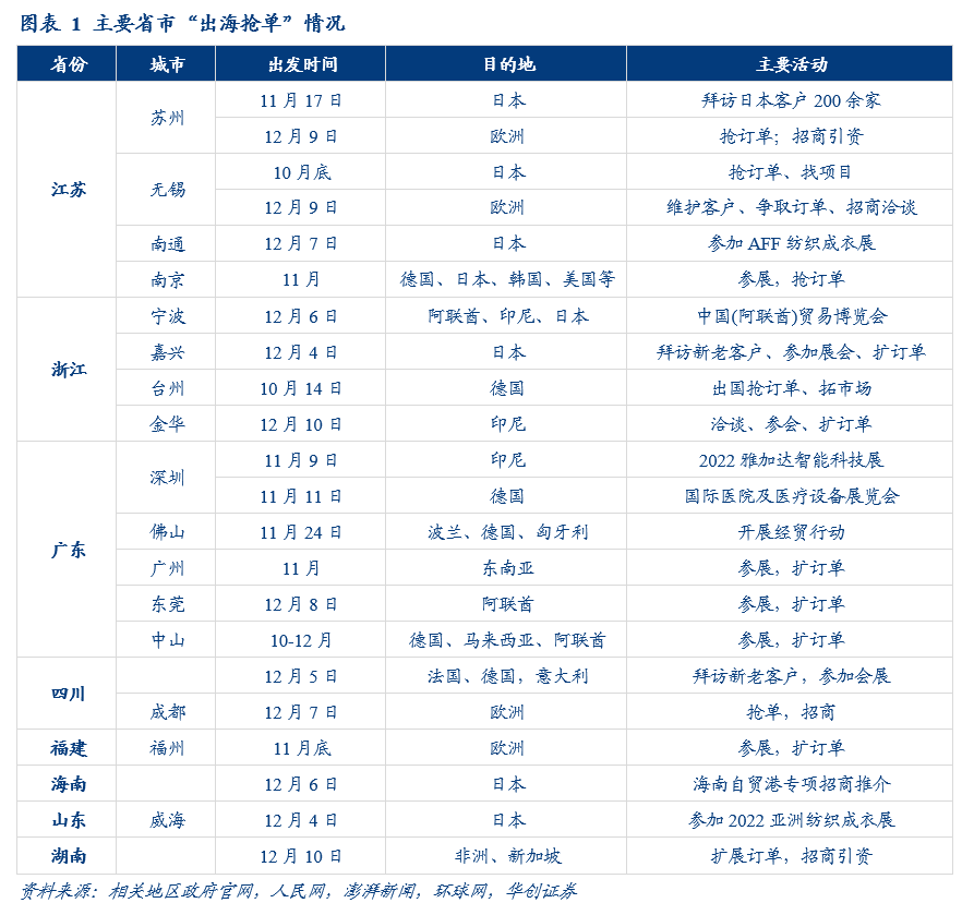 其次,多地选择在当下出海,与我国近期防疫政策优化、稳增长重心上升也有一定关系。11月以来我国防疫政策持续优化,为企业“走出去”提供了客观条件。同时,地方也将工作重点从防疫转向经济。所以我们看到,多地出海都是从11月中旬开始。12月6日,政治局会议提出“推进高水平对外开放,更大力度吸引和利用外资”,以及“让干部敢为、地方敢闯、企业敢干、群众敢创”,向地方释放了拼经济、稳增长的强烈信号。据我们统计,12月6日以来,已有苏州、南通、宁波、金华、东莞等7个地级市,以及海南、湖南省两省带队出海拓展订单。