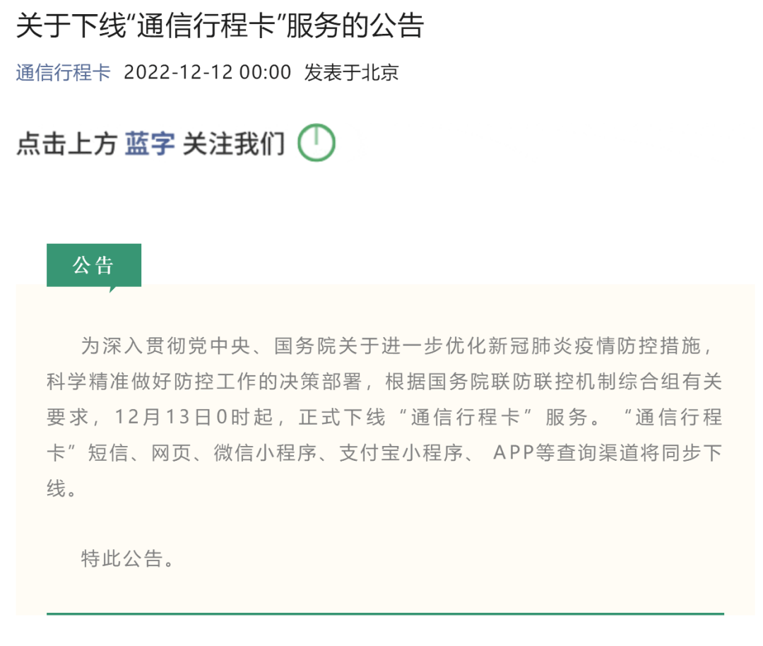 据通信行程卡官微12日凌晨消息,为深入贯彻党中央、国务院关于进一步优化新冠肺炎疫情防控措施,科学精准做好防控工作的决策部署,根据国务院联防联控机制综合组有关要求,12月13日0时起,正式下线“通信行程卡”服务。“通信行程卡”短信、网页、微信小程序、支付宝小程序、 APP等查询渠道将同步下线。