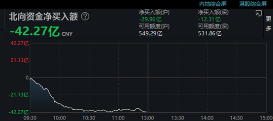 北向资金方面,今天上午呈现净卖出,半天净卖出额约42亿元。