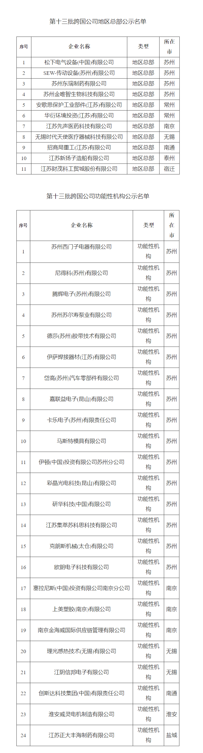 上证报中国证券网讯据江苏省商务厅12月12日消息,在各地对申报材料进行初审的基础上,江苏省商务厅进行了审核,并征求省有关部门意见,拟认定松下电气设备(中国)有限公司等11家企业为江苏省跨国公司地区总部,苏州西门子电器有限公司等24家企业为江苏省跨国公司功能性机构,现予以公示。公示时间为2022年12月12日至2022年12月18日。