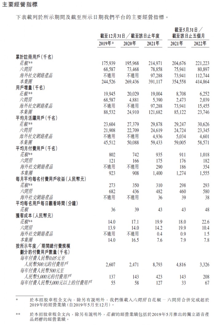 花房集团主要为用户提供音视频直播娱乐及社交网络服务。公司核心运营的在线娱乐直播平台包括花椒、六间房。按2021年月活跃用户及月付费用户以及移动端及PC端的月使用时间计,公司在中国在线娱乐直播平台中排名前二。按2021年收益计,在中国所有在线娱乐直播平台中排名第三,占2021年中国娱乐直播平台收益总额的约13.1%及中国音视频社交娱乐市场收益总额的约0.9%。