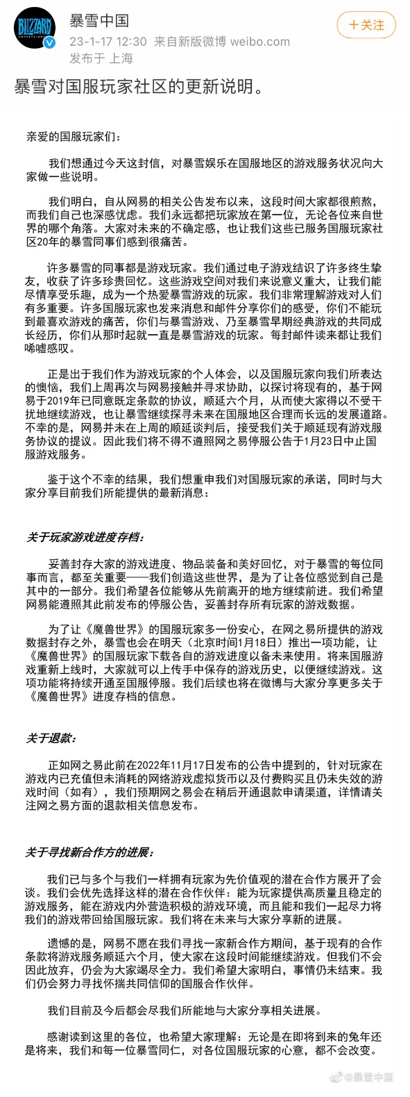 针对暴雪1月17日白天发布的说明,当日,网易在其官方公众号连夜回应,全文如下: