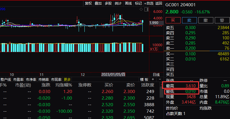 以2023年沪市一天国债逆回购品种为例,该品种当天进行操作逆回购的年化利率(也就是操作逆回购的年化收益率)一度攀高至3.610%,这一收益率远高于目前市面上绝大多数低风险理财产品的年化收益率;当天沪市一天国债逆回购品种年化收益率也一度低至0.010%,这一收益率水平甚至低于当前一些银行活期存款利率水平。