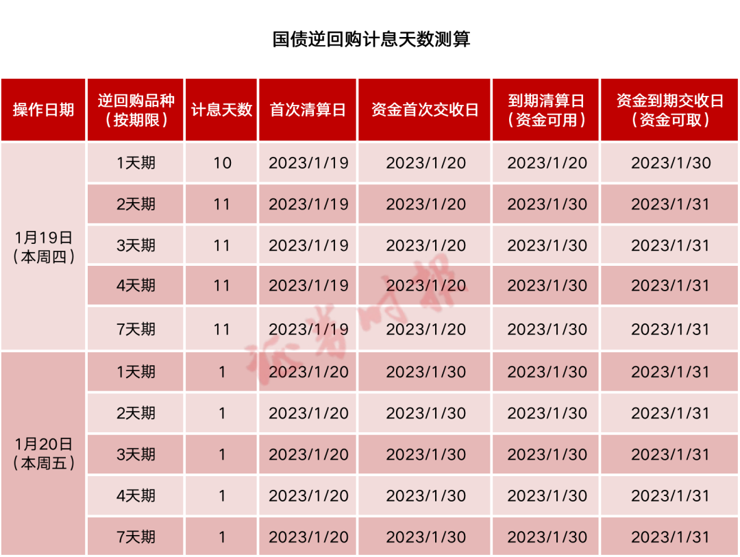 以此番春节假期前操作为例,1月19日(本周四)是比较好的操作日期,当天操作一天逆回购品种可以收取10天利息,当天操作2天逆回购品种则可以收取11天利息;而如果等到1月20日(本周五)采取操作1天期、2天期、3天期、4天期、7天期等逆回购品种,均只能收取一天利息。