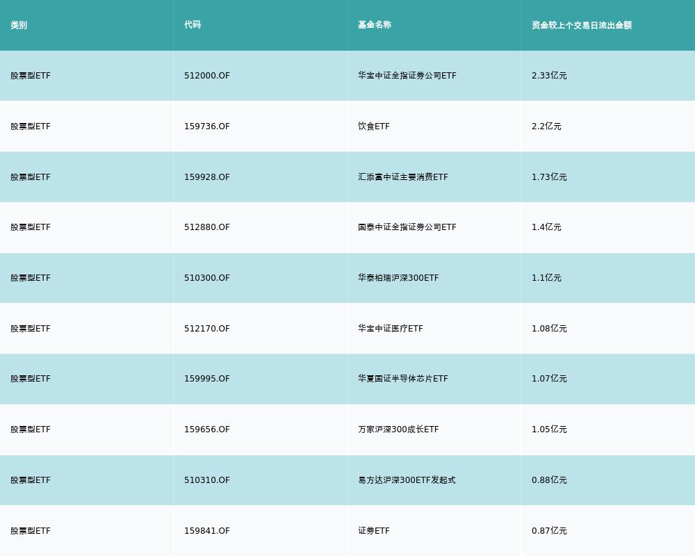 昨日股票型ETF资金流出最多的3支ETF及其流入金额分别为:华宝中证全指证券公司ETF(流出2.33亿元)、饮食ETF(流出2.2亿元)、汇添富中证主要消费ETF(流出1.73亿元)。资金流出前10详情见下表:
