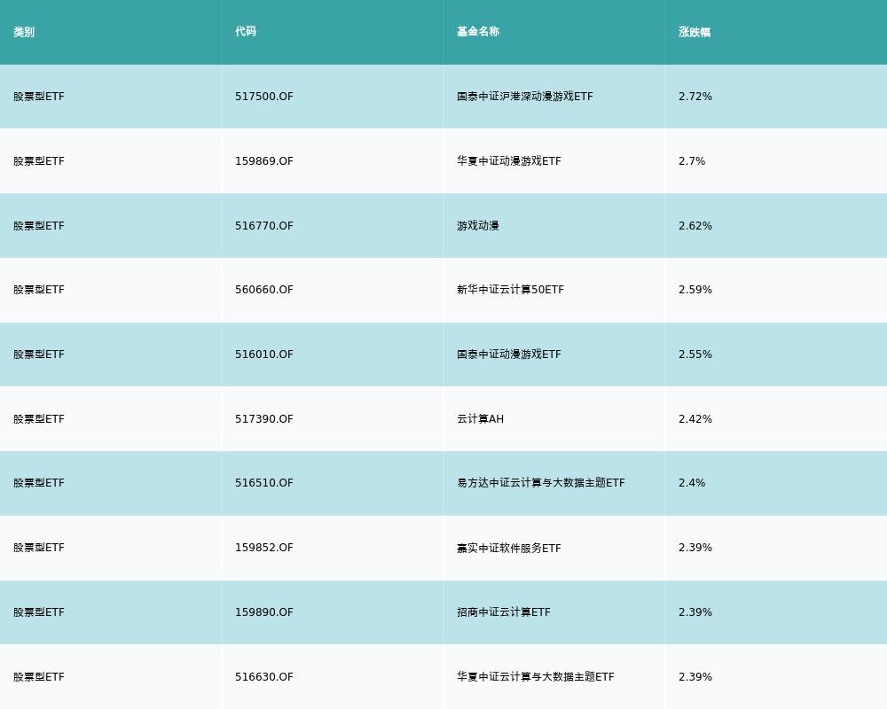 昨日股票型ETF涨幅最高的3支ETF及其收益率分别为:国泰中证沪港深动漫游戏ETF(2.72%)、华夏中证动漫游戏ETF(2.7%)、游戏动漫(2.62%)。涨幅前10详情见下表:
