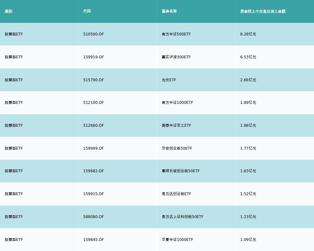昨日股票型ETF资金流入最多的3支ETF及其流入金额分别为:南方中证500ETF(流入8.28亿元)、嘉实沪深300ETF(流入6.53亿元)、光伏ETF(流入2.66亿元)。资金流入前10详情见下表: