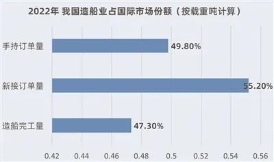 据央视网最新消息,2022年,我国造船业的国际市场份额继续保持全球第一。按载重吨计,造船完工量、新接订单量、手持订单量分别占国际市场份额的47.3%、55.2%和49.8%。在全球新船订单中,有超过49%的双燃料绿色船舶订单,均由我国建造。