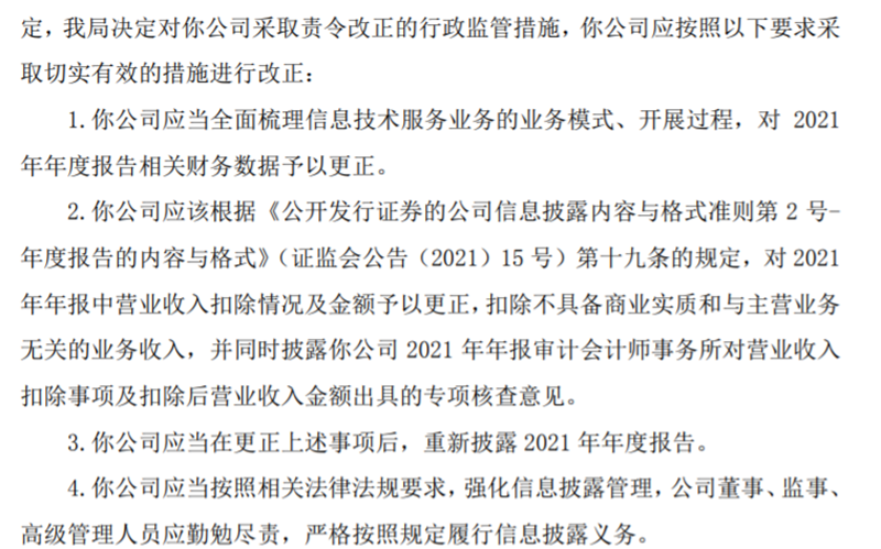 上述事项均涉及*ST科林当下的整改。江苏证监局要求,在2月1日前,*ST科林应全面梳理信息技术服务业务的业务模式、开展过程,对2021年年报相关财务数据予以更正,重新披露2021年年报。