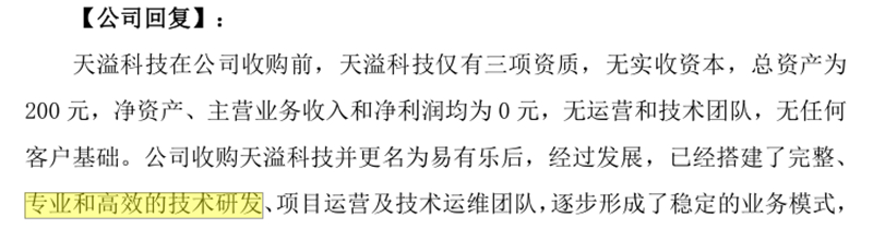 记者注意到,*ST科林此前表述存在矛盾。2022年4月15日,*ST科林回复关注函表示:“公司收购天溢科技并更名为易有乐以后,经过发展已搭建了完整、专业和高效的技术研发、项目运营及技术运维团队,逐步形成稳定的业务模式,2021年主业收入均基于稳定、可持续发展的业务模式。”