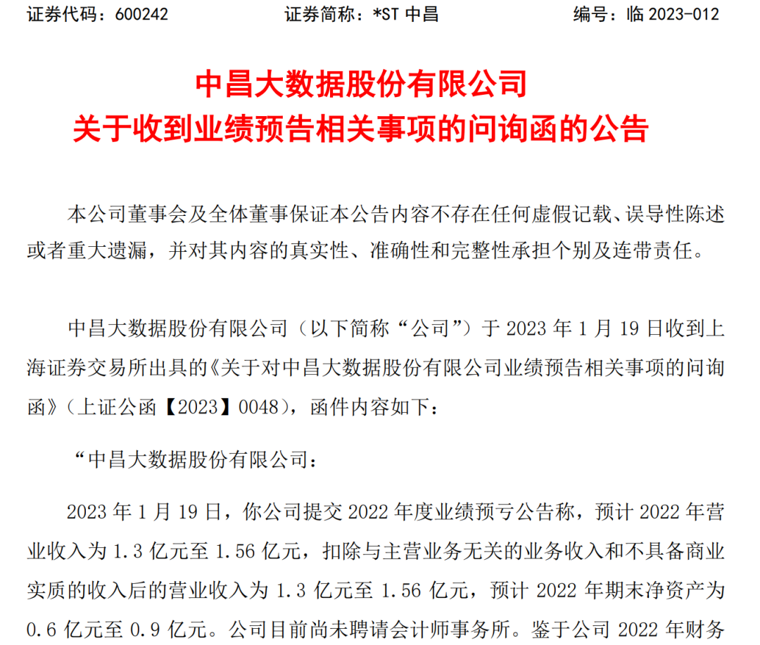 1月19日晚间,*ST中昌(600242)披露业绩预告后,马上收到上交所问询函。上交所提示*ST中昌“若公司涉嫌未按规定对营业收入予以扣除,规避终止上市情形,我部将及时提请启动现场检查等监管措施”。