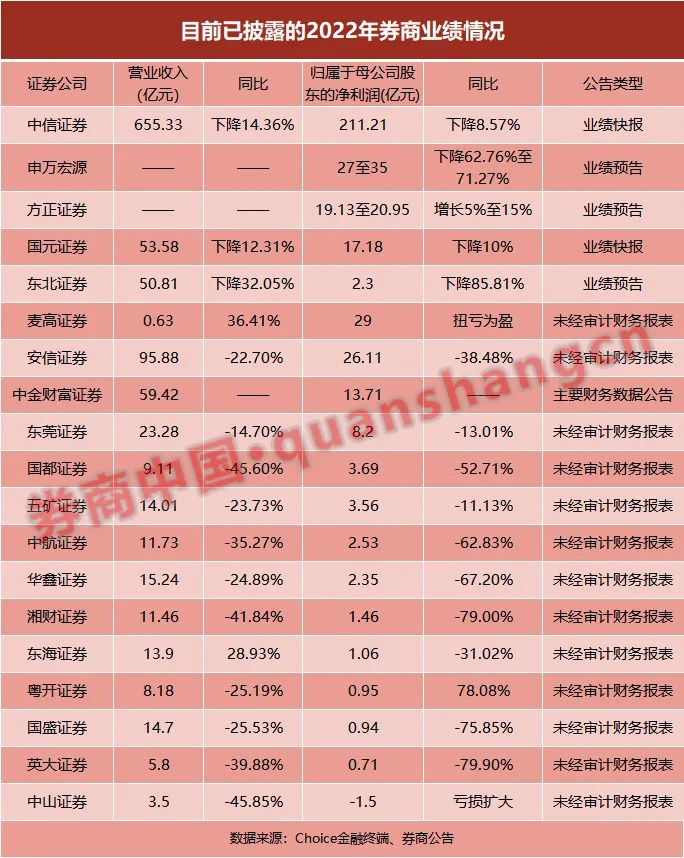 截至目前,至少已有19家券商披露2022年度经营业绩情况。其中,包括方正证券、申万宏源、东北证券、中信证券、国元证券等上市券商采取业绩预告、业绩快报形式;此外还有十余家为新三板或上市公司子公司,已披露了2022年未经审计财务报表。