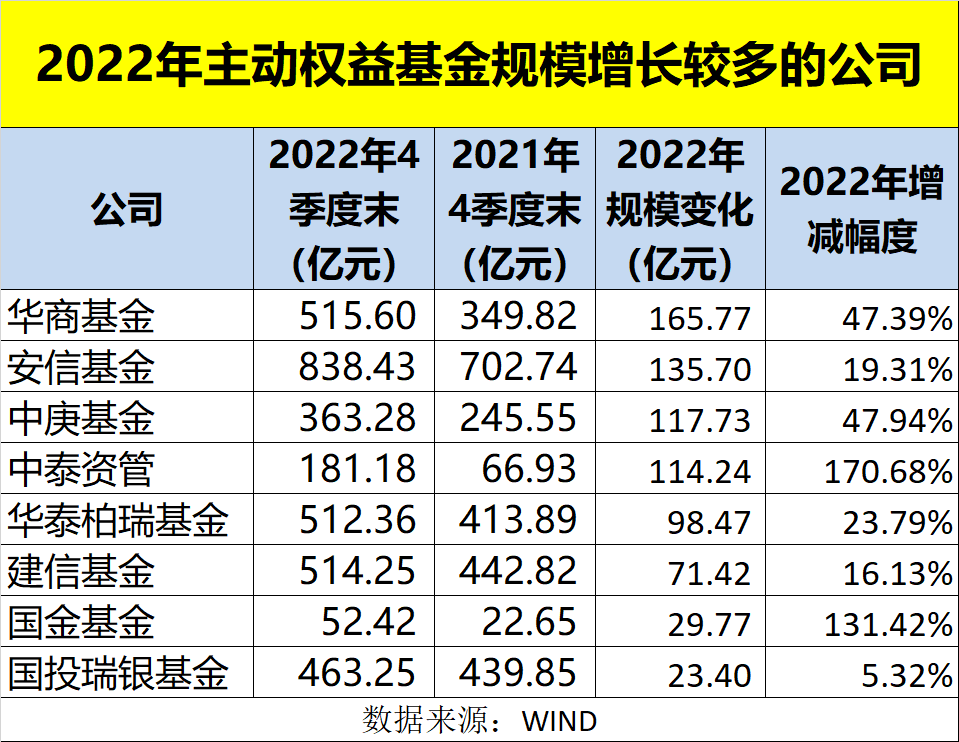 华商基金去年四季度末主动权益基金规模达到515.6亿元,相比去年年末增长了165.77亿元,位居基金公司主动权益规模增长榜首。紧随其后的是安信基金,去年底主动权益基金规模达到838.43亿元,相比去年年末增长了135.7亿元,此外中庚基金、中泰资管在2022年主动权益基金规模增长也超百亿,尤其中泰资管增长率超过170%。