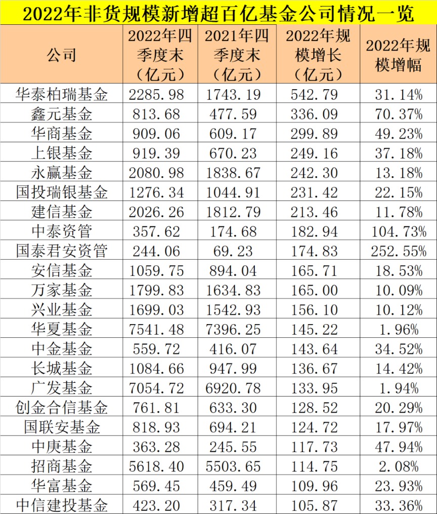 数据显示,相较2021年底,2022年有22家基金公司新增的非货币规模超过百亿,这些基金公司都依靠百亿级的规模增长,基金公司规模排名都上升,实现了大发展。