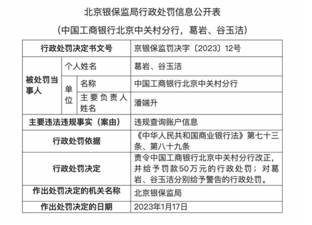 1月28日,北京银保监局行政处罚信息公开表显示,2023年1月17日,北京银保监局责令中国工商银行北京中关村分行改正,并给予罚款50万元的行政处罚;对葛岩、谷玉洁分别给予警告的行政处罚。主要违法违规事实为,违规查询账户信息。