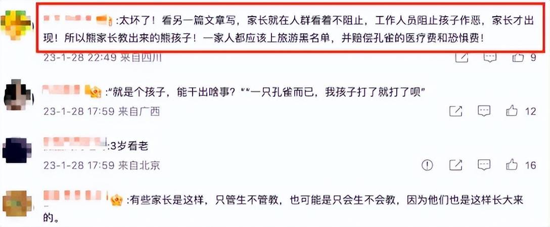 网友怒怼:果然熊孩子的背后都是熊家长。男生摔打孔雀的时候家长不出现,可能还在旁边拍照,觉得儿子“勇敢”,现在看管理员来了,怕儿子吃亏才现身,这不就是欺软怕硬吗?